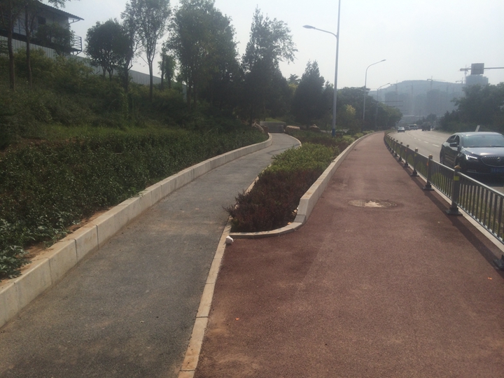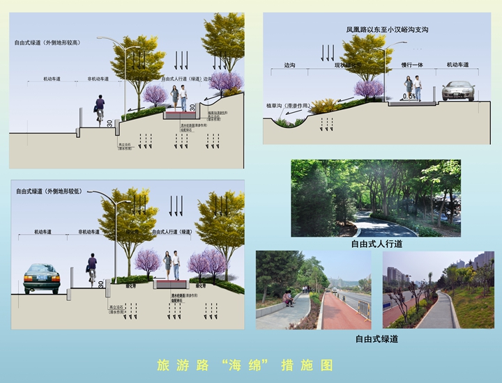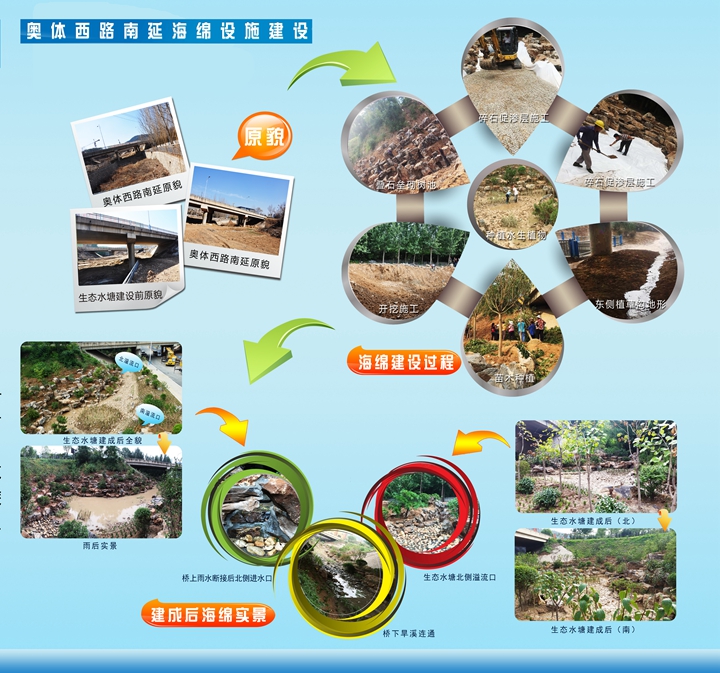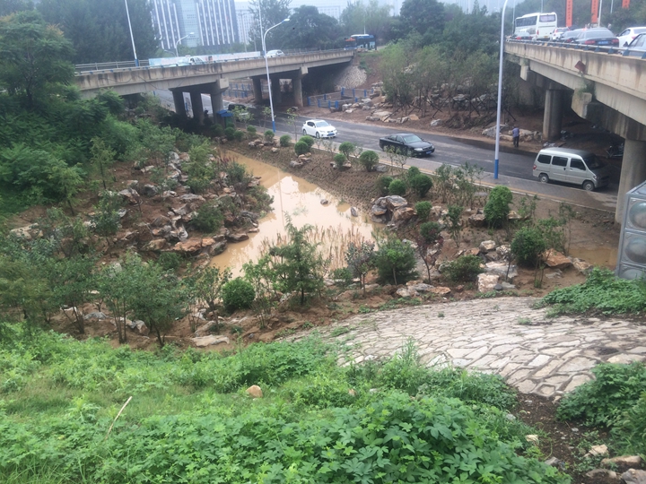 奥体西路南延原为断头路,道路红线范围及东西侧空间原状均为荒地,旅游路北桥北侧原为大辛河支沟上游河道。结合本次奥体西路南延道路蘑菇视频建设,充分落实海绵城市建设理念,重点对桥下空间因地制宜进行挖潜,精心设计建设了1500余平方的生态水塘、植草沟、旱溪等海绵蘑菇视频设施。通过对旅游路部分路段雨水进行断接,使上游区域雨水先进入生态水塘等设施进行生态净化和下渗,渗后多余的雨水再溢流进入大辛河支沟,彻底改变了该路段原有的雨水直排模式。