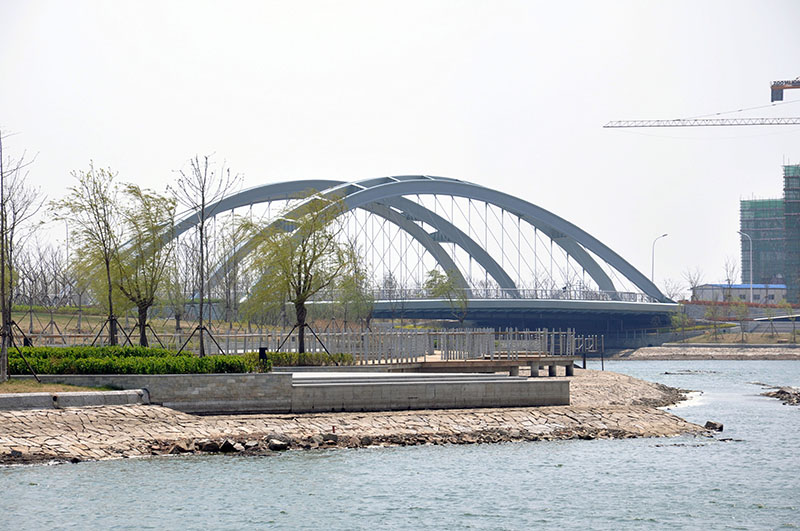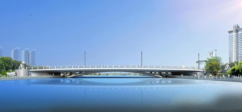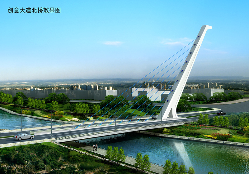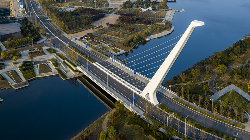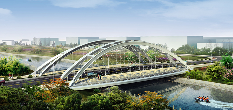 汇智桥路南、北桥均为无背索独塔单索面斜拉桥,桥跨 82 米,全宽 33.5 米;智力岛路桥为单跨新型斜靠式拱